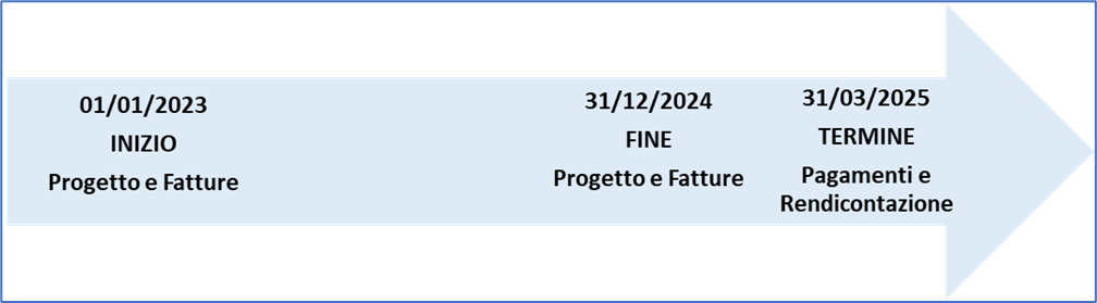 • Data termine pagamenti ed invio documenti per rendicontazione: il termine per eseguire gli ultimi pagamenti e per presentare la richiesta di erogazione del contributo è prevista per il 31/03/2025.